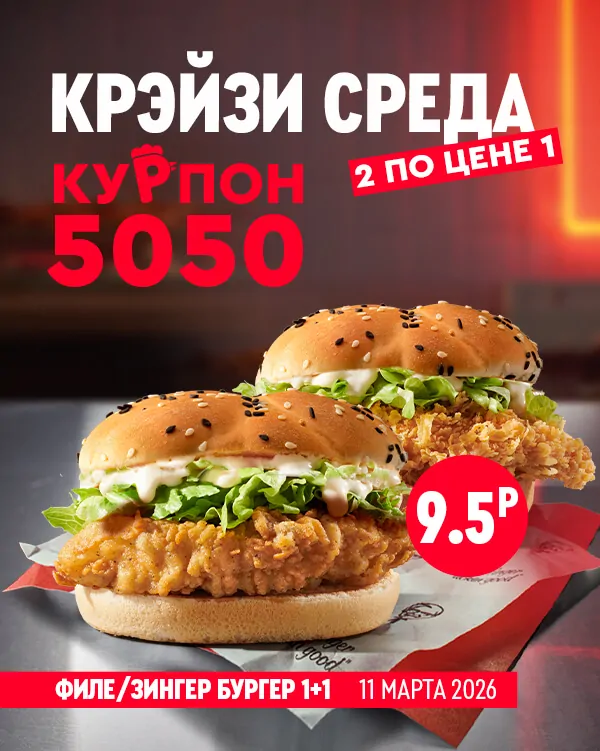 Главная страница » Филе или Зингер Бургер: только 11 марта 2026 года (Купон 5050) Филе или Зингер Бургер: только 11 марта 2026 года (Купон 5050) Просмотров 42к. Опубликовано 11.03.2026